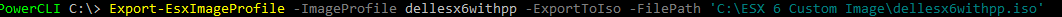 - Now you can export the image profile to a ISO Export-EsxImageProfile -ImageProfile dellesx6withpp -ExportToIso -FilePath ‘C:\ESX 6 Custom Image\dellesx6withpp.iso’